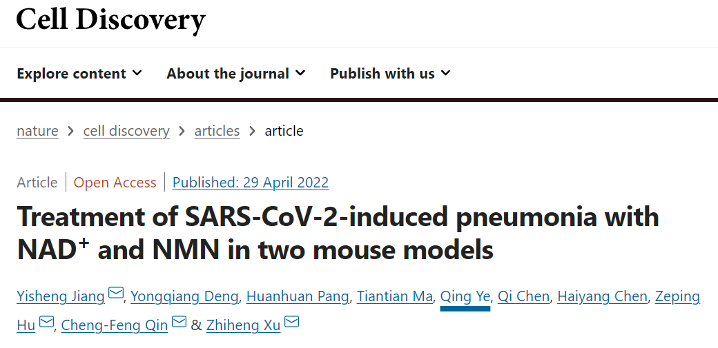 2022年4月29日,中科院联合北京大学与清华大学在国际科学期刊《Cell Discovery》发表了题为“Treatment of SARS-CoV-2-induced pneumonia with NAD+ and NMN in two mouse models”的最新临床前研究,研究证明补充NAD+前体NMN可治疗新冠病毒感染导致的基因表达和代谢紊乱,从而挽救新冠小鼠的生命。