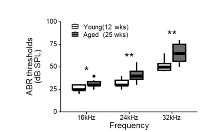 和人类一样,老鼠的听力也会随着年龄的增长而自然丧失。为了证实这一点,研究人员将25周龄老鼠(相当于人类的30岁)的听力与12周龄老鼠(相当于人类的21岁)的听力进行了比较。研究发现,25周龄老鼠的听觉脑干反应(ABR)阈值(刺激脑干电活动的声音强度阈值)高于12周龄老鼠,这表明老鼠在25周龄时就会出现听力丧失。